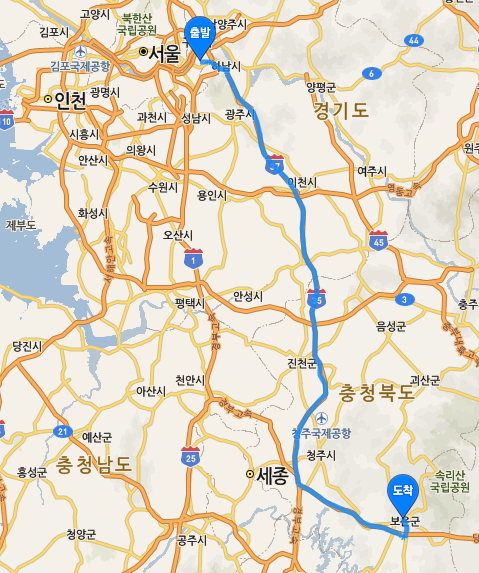 굽은다리역에서 보은국민체육센터까지 네이버 지도록 검색한 결과입니다. 2시간 10분정도 걸리네요.