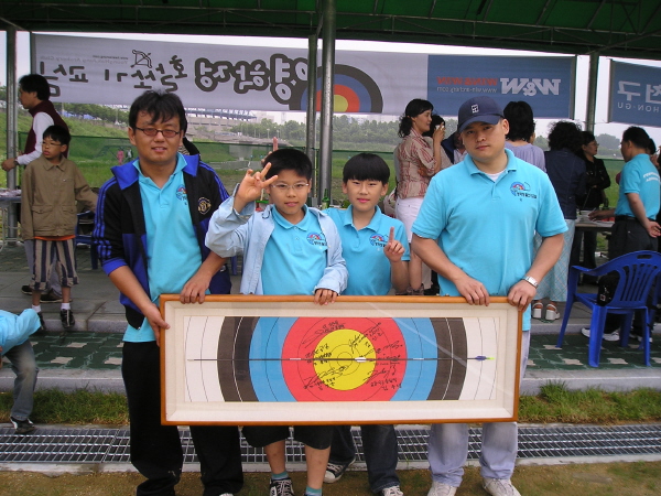 로빈훗된 화살을 액자로, 그리고 그 안에는 양궁 스타들의 사인들이 가득합니다.