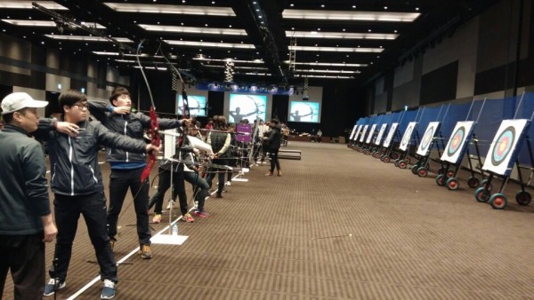 현대 및 기아자동차 신입사원을 대상으로, 역대 한국 양궁 금메달리스트들이 참여하여 양궁 교육을 진행한 사진입니다.